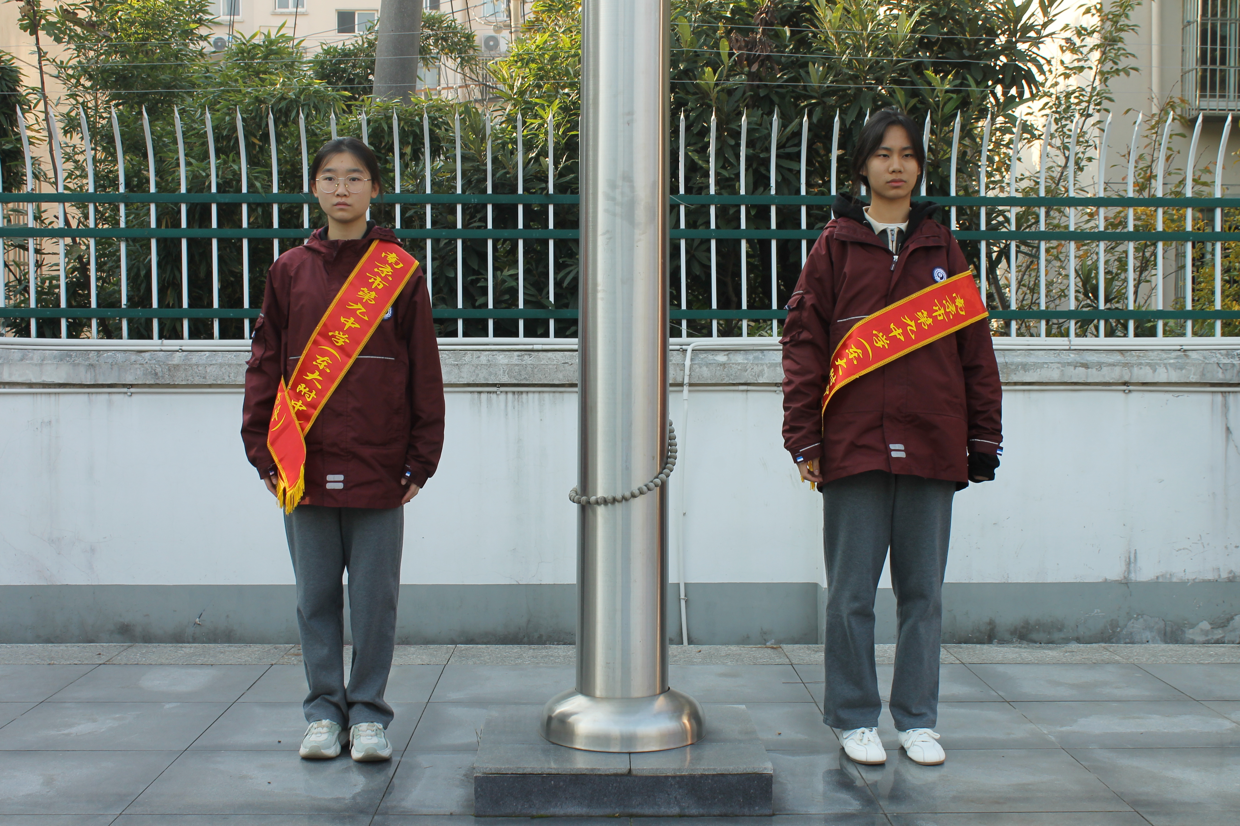本周的升旗手是高三(9)班吕家乐同学和高二(15)班的王钰涵同学。他们不仅是学习上的佼佼者,积极进取,刻苦钻研;更是班级建设的核心力量,展现着九中学子的精神风貌。在庄严的升旗仪式中,全体师生行注目礼,场面肃穆。