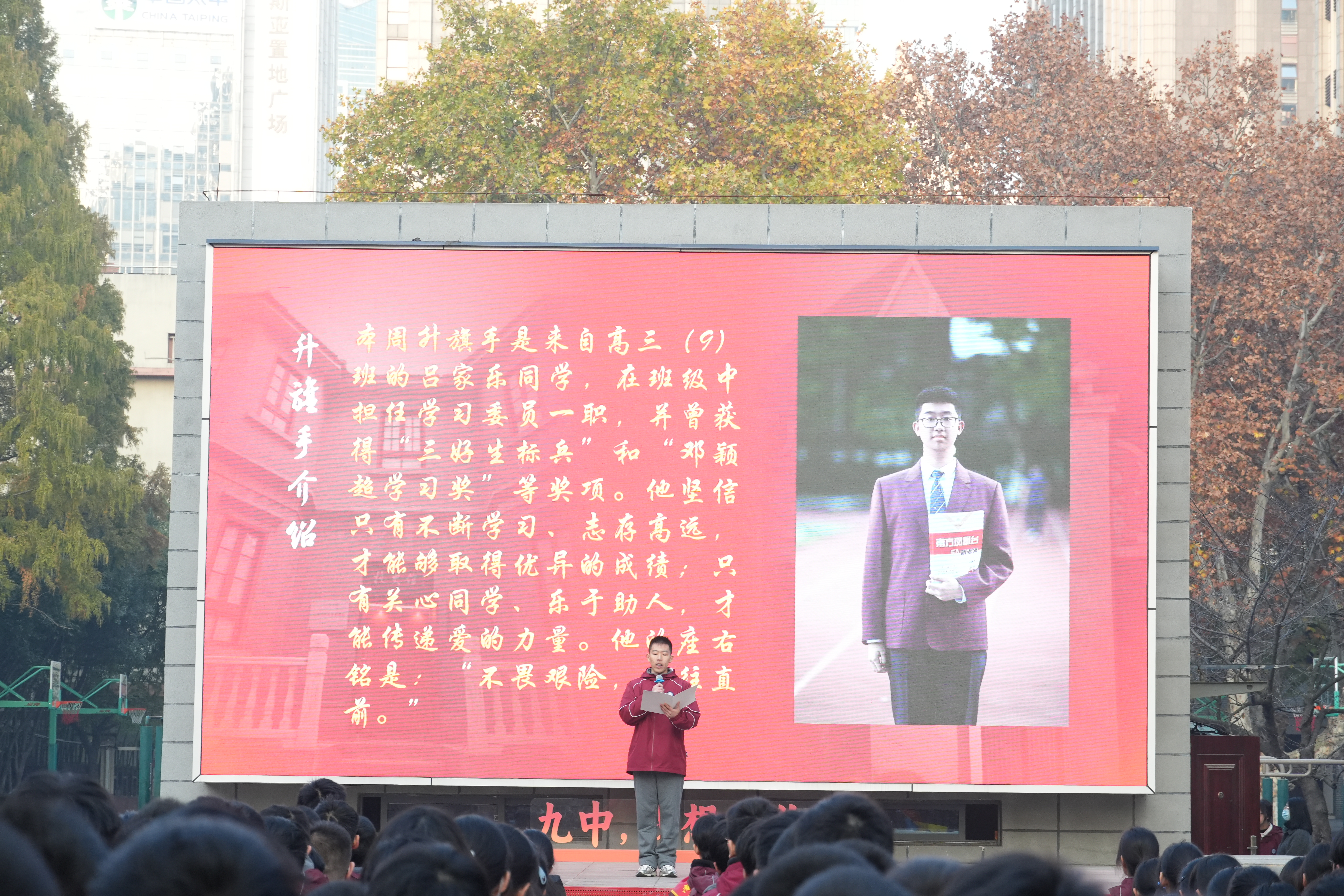 本周的升旗手是高三(9)班吕家乐同学和高二(15)班的王钰涵同学。他们不仅是学习上的佼佼者,积极进取,刻苦钻研;更是班级建设的核心力量,展现着九中学子的精神风貌。在庄严的升旗仪式中,全体师生行注目礼,场面肃穆。