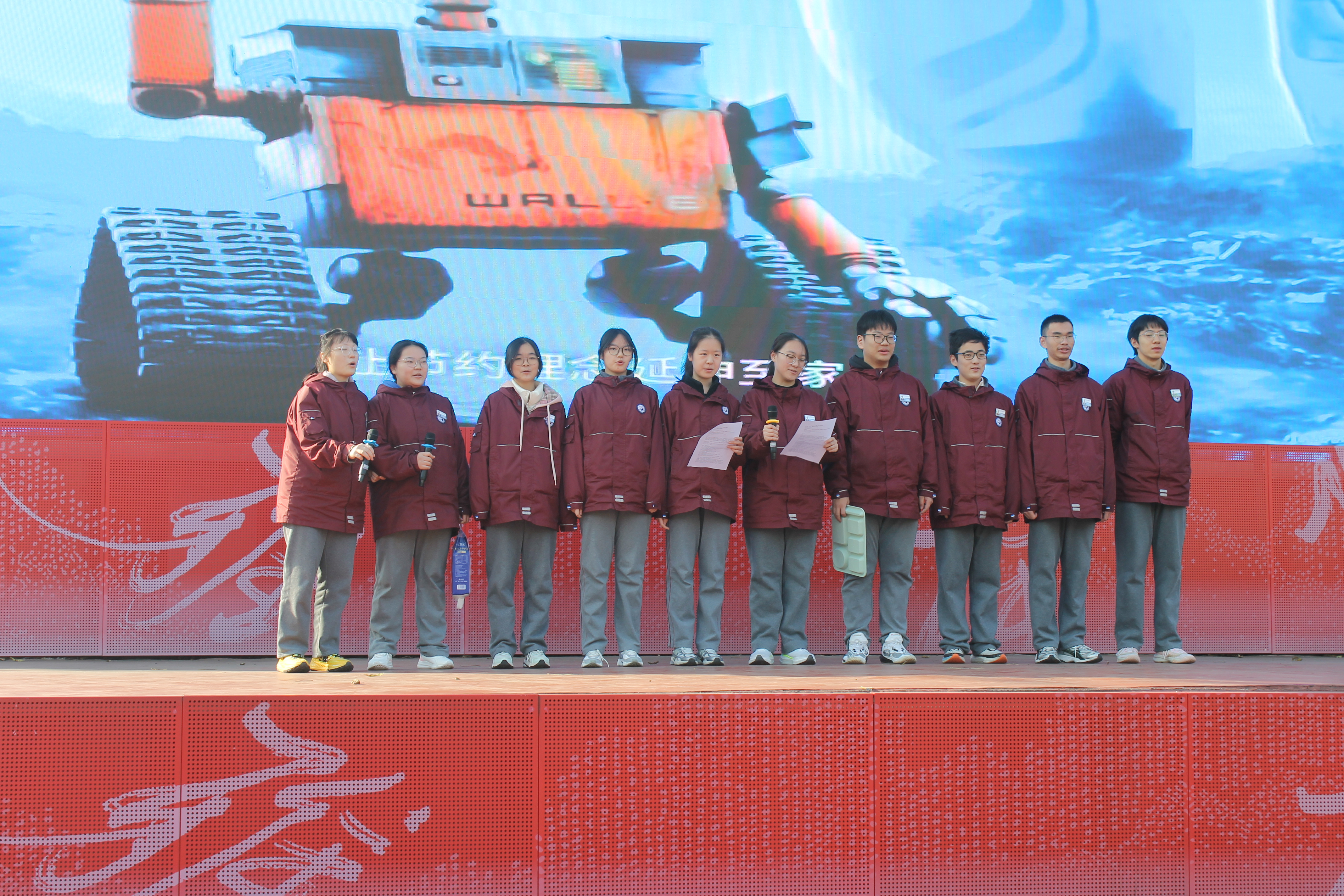 紧接着,高二(1)班和(17)班围绕“俭以养德、勤以立身”的主题,展开主题活动。高二(1)班学生通过视频拍摄将学校中存在的浪费现象精准呈现,真实情景触动学生心灵;高二(17)班学生则借助智能机器人瓦利,通过情景剧表演引发学生思考、品悟。针对校园中容易被忽略的浪费现象,他们发出倡议:在能源方面,做到“人走灯灭,人离电断”;在水资源方面,倡导“点滴珍惜,拧紧生命”;在粮食安全方面,坚持“餐餐光盘,拒绝剩宴”;在物品使用方面,践行“物尽其用,循环再生”。
