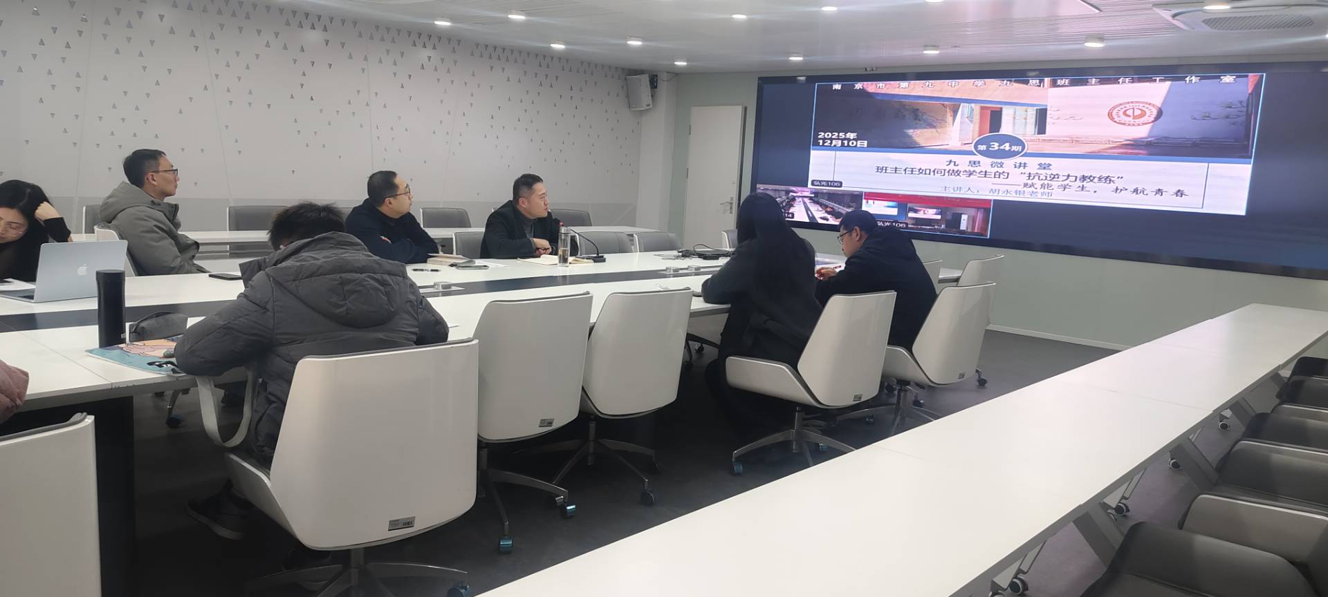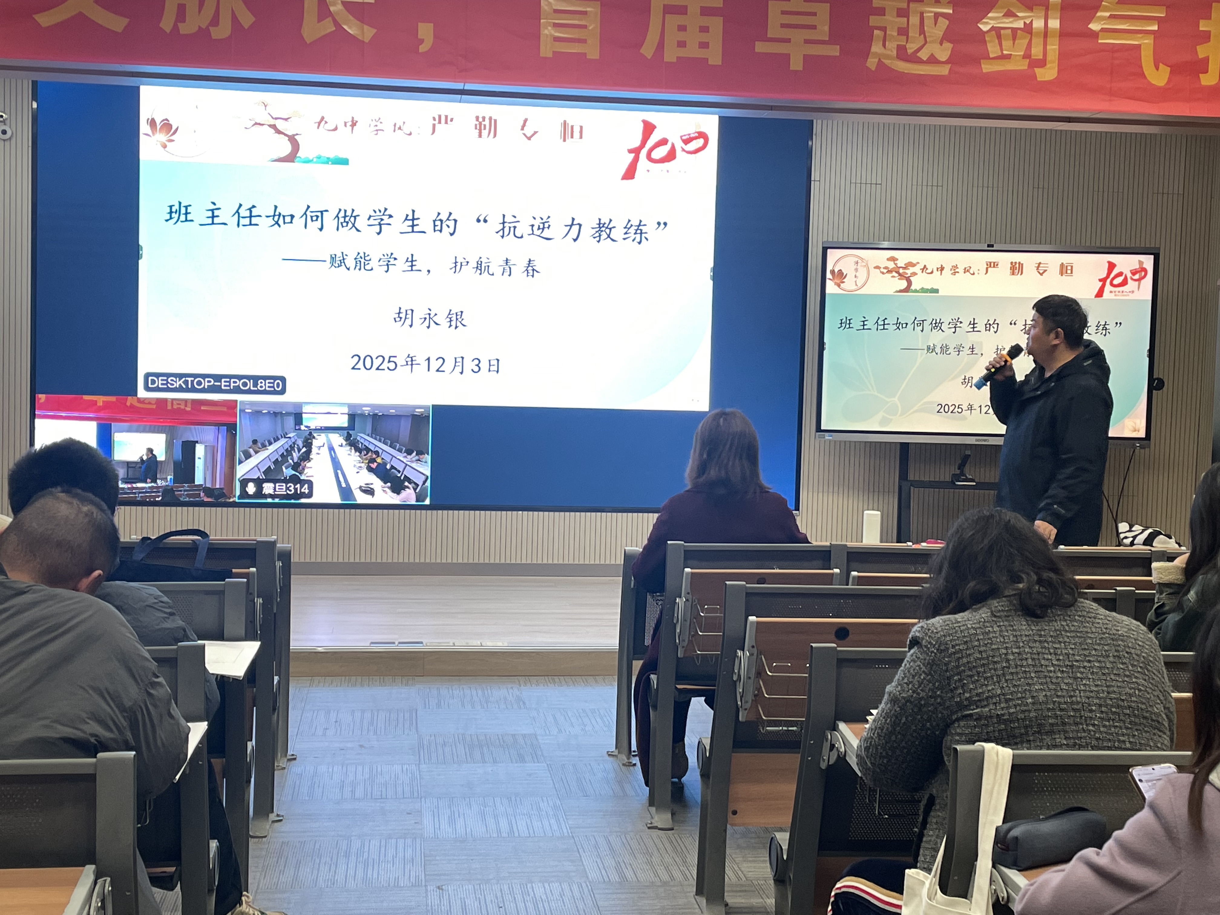 为强化班级管理实效,筑牢学生心理健康防线,12 月 10 日,南京市第九中学召开 2025-2026 学年第一学期班主任专题会议。本次会议由德育处主任韩丽丽老师主持,以 “用爱润抗逆,以榜样塑博雅” 为主题,点明近期常规工作与德育重点,特邀胡永银老师开展 “抗逆力教练” 专题讲座。