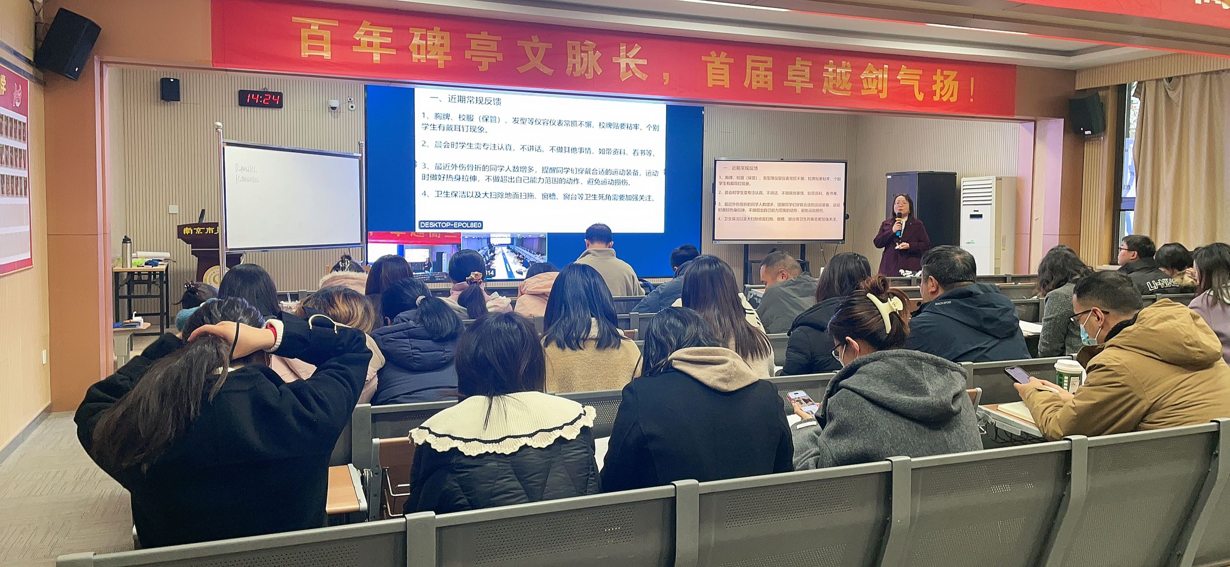 会议伊始,德育处针对近期校园常规进行反馈,强调仪容仪表、晨会纪律、卫生保洁等基础工作需常抓不懈。针对冬季 H3N2 甲流高发态势,学校要求班主任联动家长落实健康防护措施,通过教室通风消毒、配备防疫物资等手段,筑牢校园健康屏障。同时,针对运动损伤增多的情况,提醒学生规范运动装备使用,做好热身防护。下阶段德育工作中,学校明确多项重点任务:完成 “勿忘国耻、圆梦中华” 主题黑板报;各年级启用特色班牌,彰显 “抗逆+博雅” 育人理念;同步推进 “感动九中年度人物” 与第六届 “博雅少年” 评选,通过榜样引领营造优良校风。