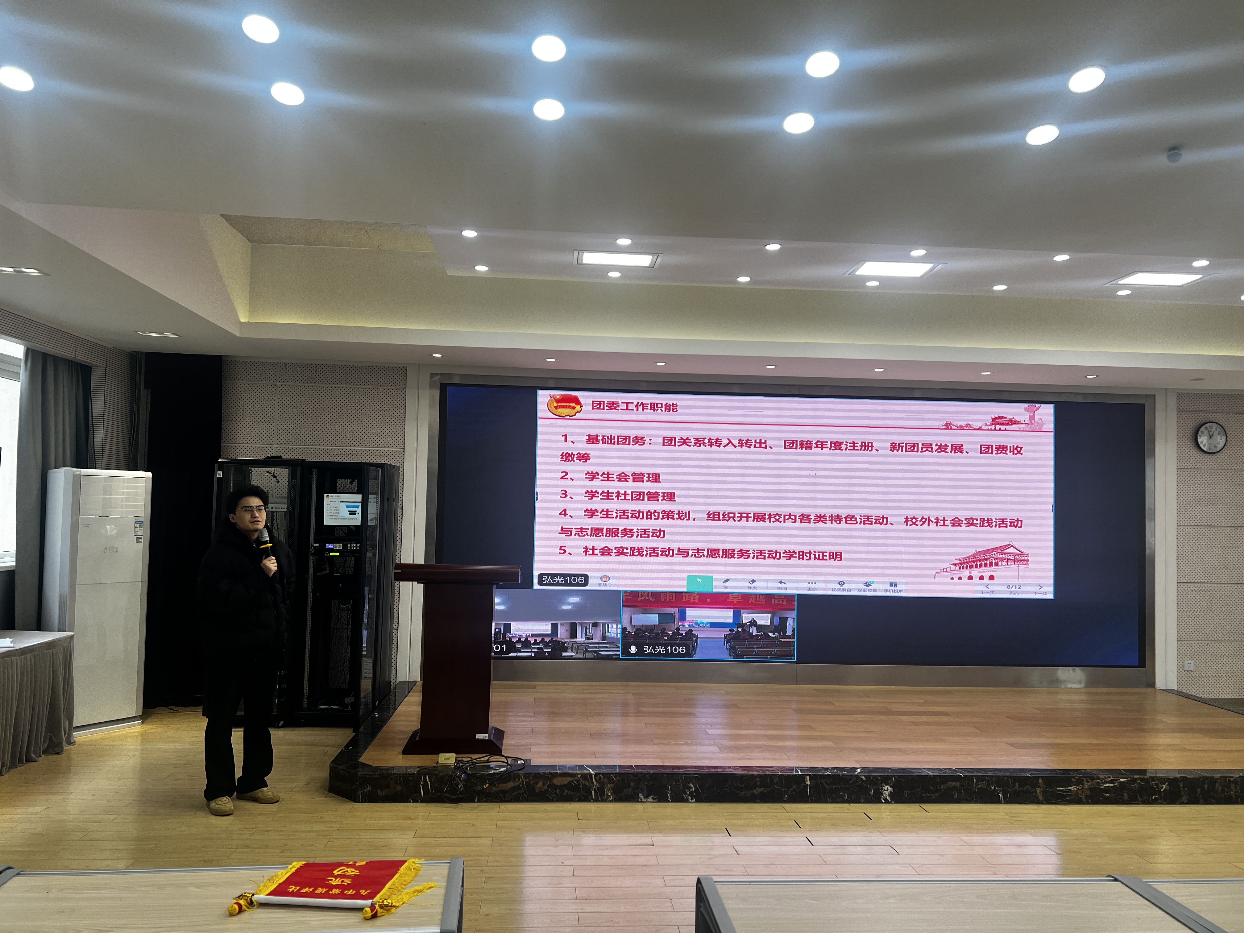 会议的第三部分,由薛剑波老师对两校区高一年级班长、团支书进行专题培训。薛老师重点围绕团委新学期工作要点、社团活动规范化管理以及班团工作职责等方面展开讲解。他鼓励高一年级的学生干部积极投入到校园文化建设中来,勇于尝试,敢于创新,在服务同学、组织活动的过程中锻炼自我、提升能力。培训内容详实具体,为高一年级学生干部新学期工作的开展指明了方向。
