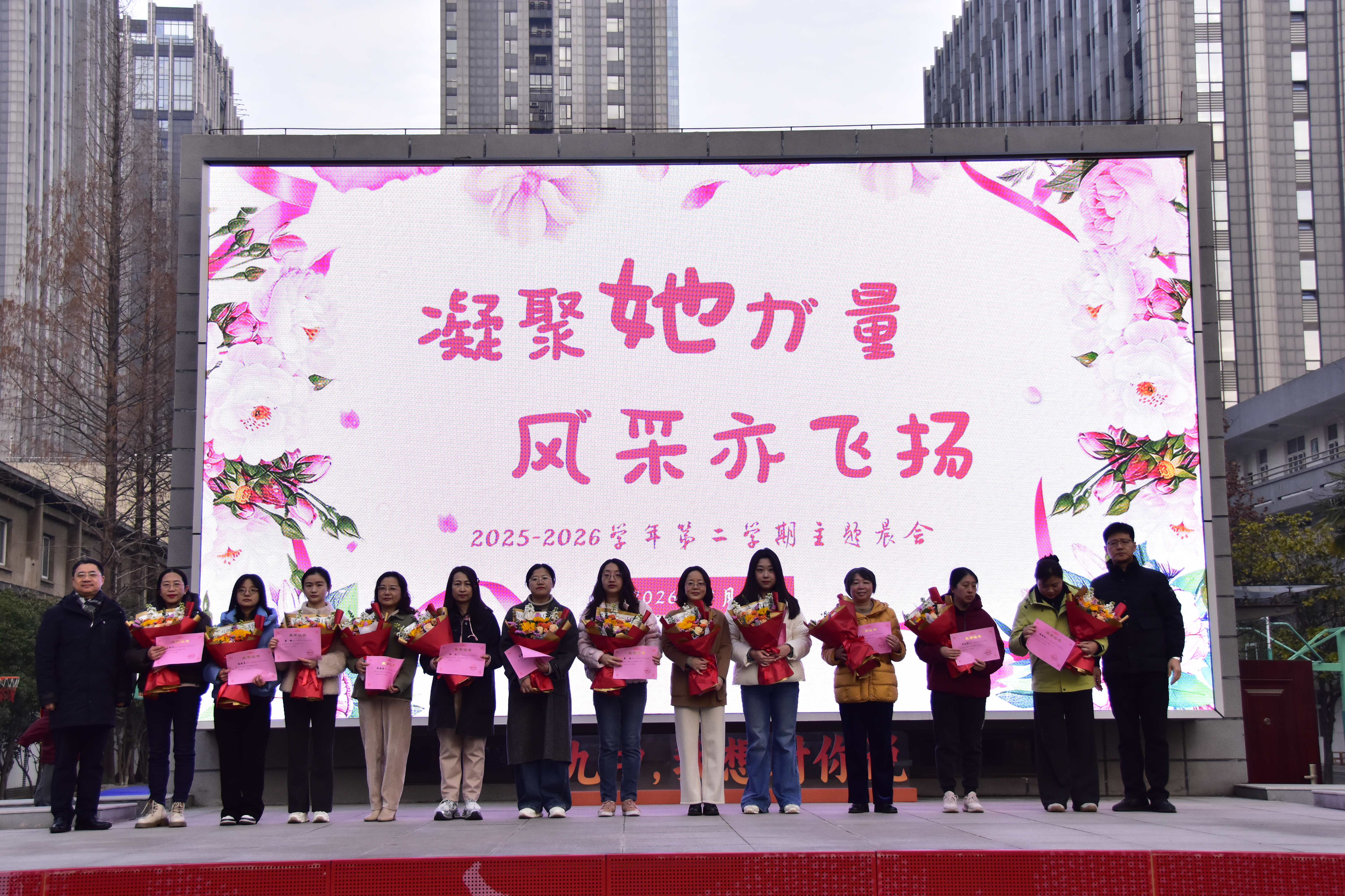 升旗仪式后,陈晓健校长和吴昊副校长分别宣读《南京市第九中学2025年度“优秀巾帼奖”表彰决定》。经各工会组民主推荐、党政工联席会研究,授予庄瑜璐、周佳、徐小艳、刘奕廷、朱蓓、佘晓丹、邓旭景、朱红珏、季源、王海棠、陆春芳、王红娟、罗丹、舒钟卫、夏正敏、倪凤、蔡洁、刘美仪、史文萱、严金淑、孙莎莎、曾嘉赟、蒋泽元、水自清、左蓉、陈珍年、聂振荣、唐姝、孙欢、都海英、刘金里、方琴、王秀林、储昭阳等34名女教工2025年度“优秀巾帼奖”称号。