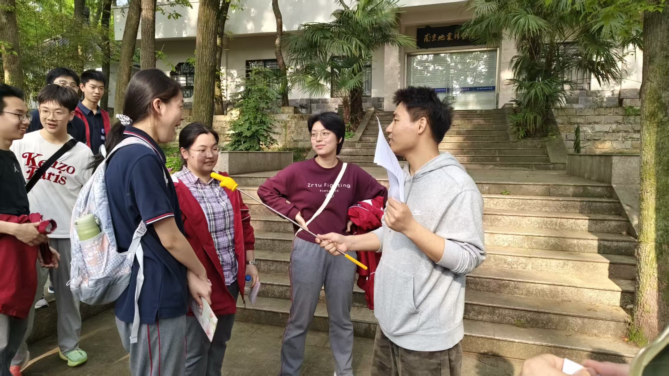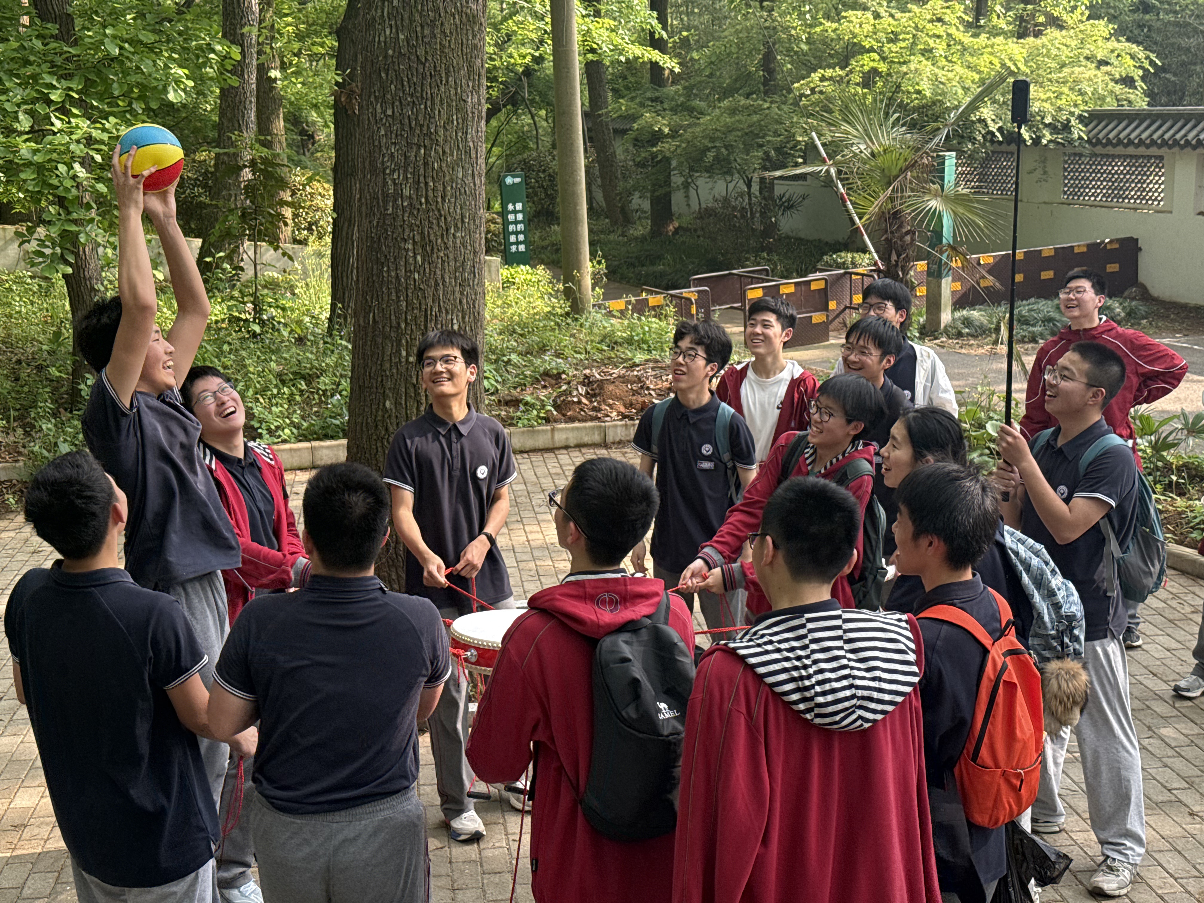 行走途中,全体师生沿既定路线稳步前行。驻足地震馆、流连流徽榭,同学们在自然与人文景致中放松身心。途中设置 “飞花令”“击球颠高”等互动环节,既展现学子知识储备与校史底蕴,又考验班级默契配合与同窗信任,以 “海棠・凝情” 凝聚温暖情谊。