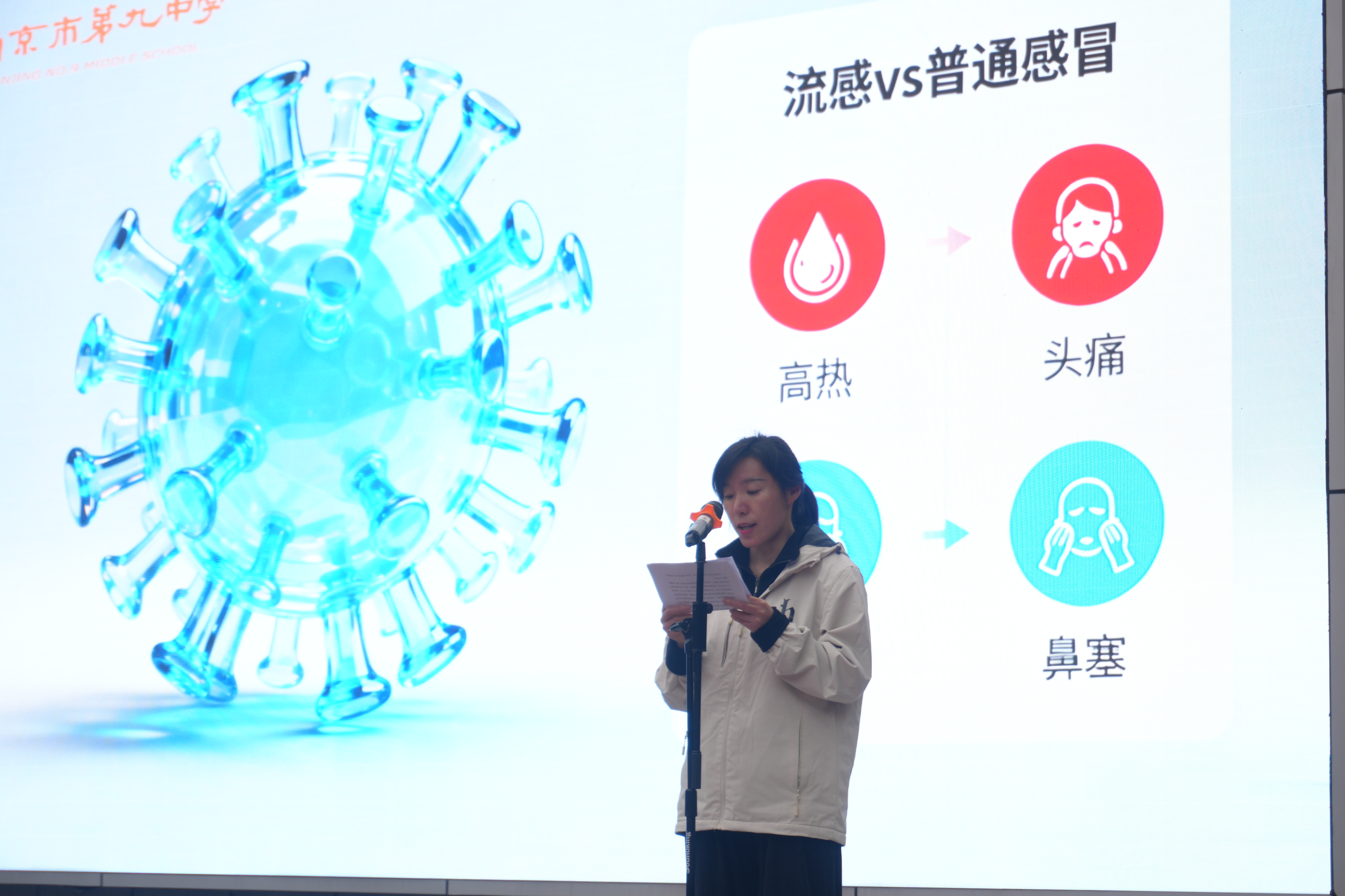 随着秋冬时节来临,天气转凉、气温波动频繁,人体抵抗力面临考验,正是感冒等呼吸道疾病的高发期。会议指出,同学们在专注学业的同时,必须将维护健康放在同等重要的位置,争做自己身体健康的第一责任人。为提供专业、科学的防护指导,学校特邀温静校医和施月婷校医为全体师生做专题分享。两位校医经验丰富,长期负责处理学生的外伤与常见病症,是师生健康的坚实守护者。在热烈的掌声中,温校医和施校医就秋冬季节常见传染病的预防、个人卫生习惯的养成、合理膳食与作息等方面进行了深入浅出的讲解,为大家带来了实用而全面的健康知识。