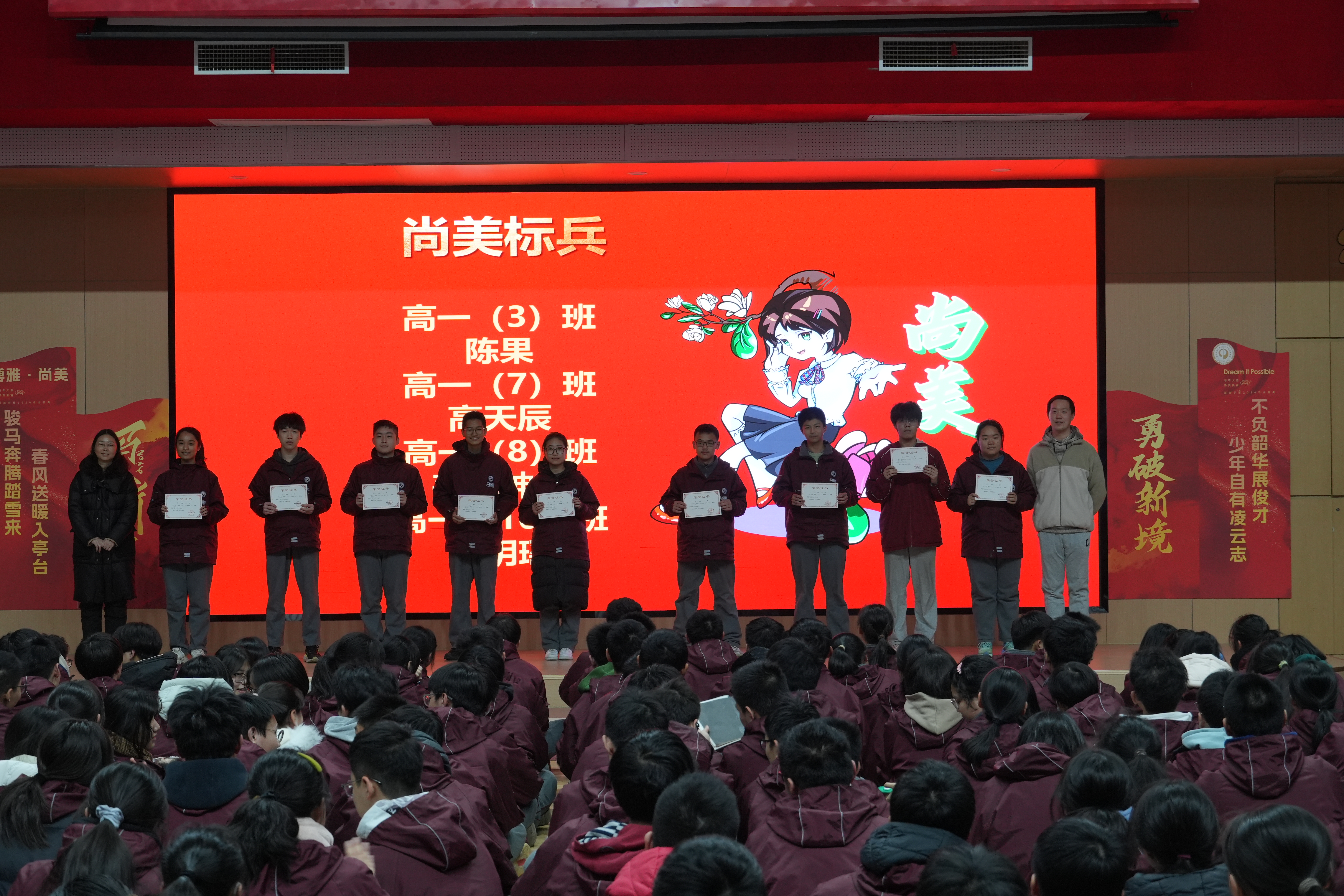 学习成绩的突破彰显成长力度,综合素养的提升更显青春厚度。为践行“博雅”育人理念,引导九中学子以德立身、全面发展,大会颁发了“博雅少年”“雅行标兵”“尚美标兵”荣誉称号。获奖同学或严于律己、恪守校规,以良好品行诠释文明素养;或乐于助人、团结同学,用真诚善意传递集体温暖;或心怀热爱、涵养情操,在实践中绽放光彩。