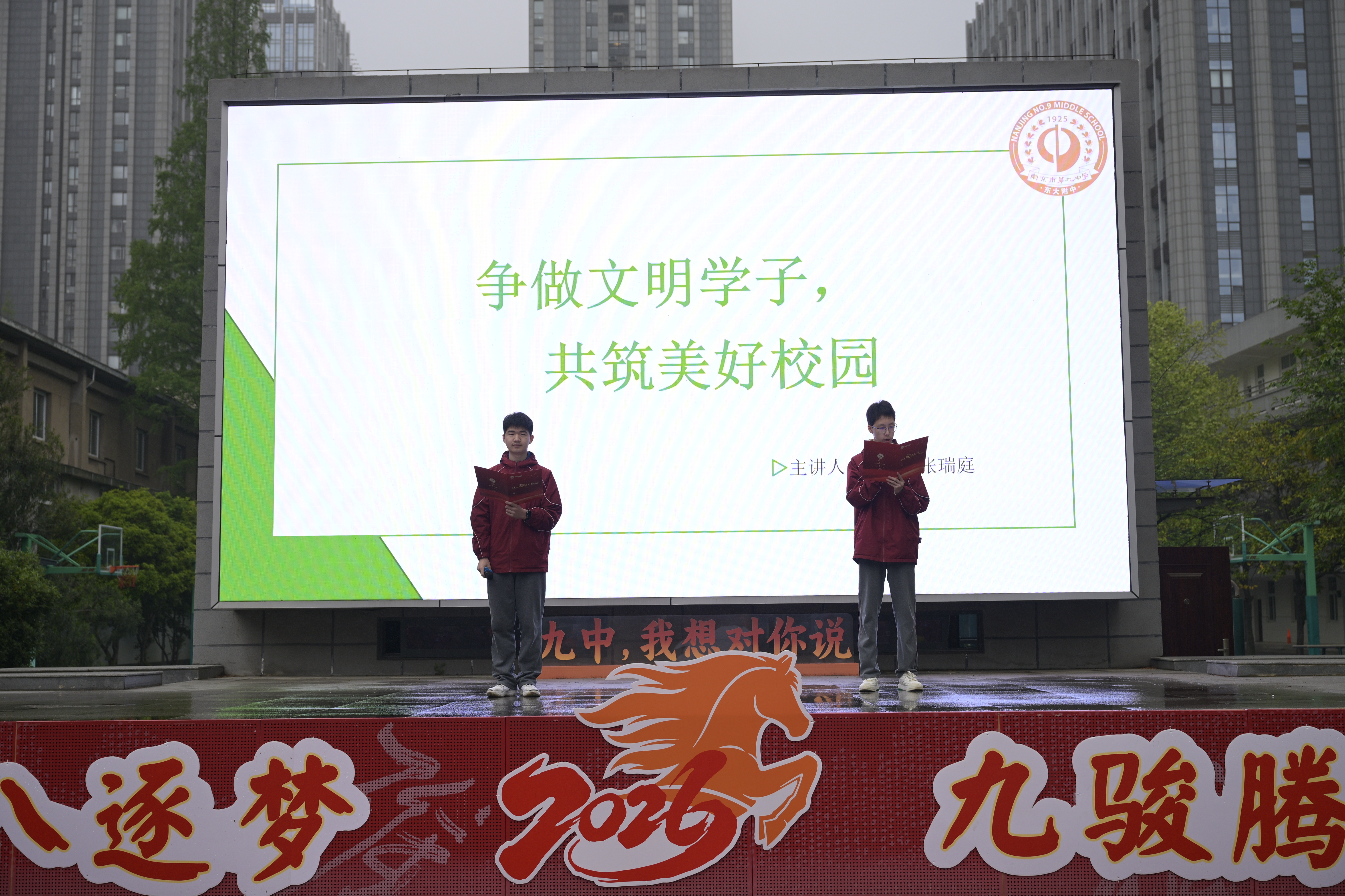 4月13日清晨,南京九中举行“争做文明学子,共筑美好校园”主题晨会。本周升旗手为高二(7)班张文甲同学,他以身作则、勤奋踏实,人生格言是:“革命不会瓜熟蒂落,你必须亲自采摘果实。”学生会主席谭天和自律部副部长张瑞庭作主题演讲,指出文明体现在点滴细节中:主动问好、靠右行走、光盘行动、随手捡垃圾、友善待人。同时向全体同学发出四点倡议:尊师有礼、守纪守规、爱校护校、自律自省。文明始于言行,习惯铸就品格。本次晨会号召全体九中学子从小事做起,让文明之花在校园处处绽放。